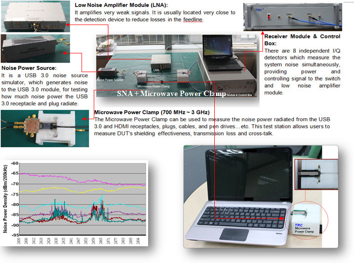 To understand how the USB 3.0 modules affect the WLAN antennas, and quantify the effects of the USB 3.0 noise power on the WLAN antennas in ultrabooks, experiments have been conducted, inclusive of the measurement of the WLAN antennas’ throughput rate, and the measurement of the amount of the noise power received by the wireless LAN antennas. Equipments such as Microwave Power Clamp, System Noise Analyzer (SNA), Noise Floor Measurement System (NFS), and Platform Noise Scanner (PNS) have been developed to help our clients with their critical R&D stage by minimizing platform noise and maximizing RF performance. |
