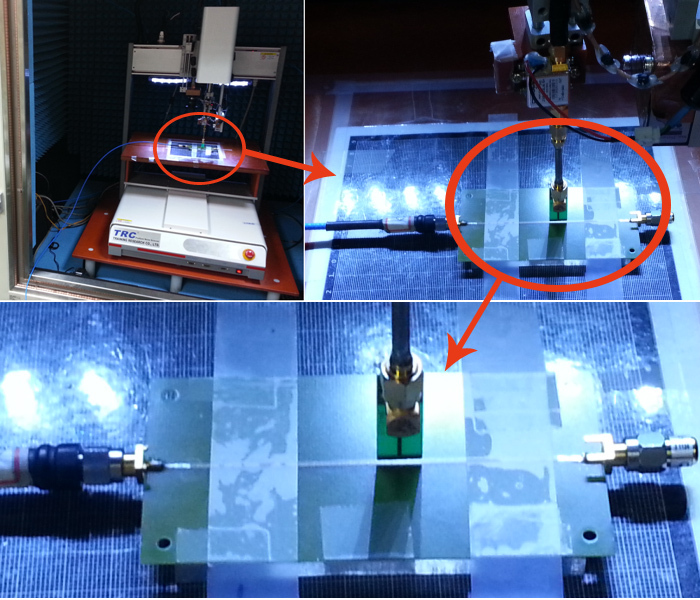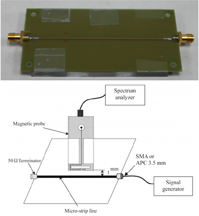The VCCI calibration board shown above complies with IEC-61967-6, and the calibration setup is also shown above. The distance between the edge of the magnetic probe and calibration board is 1mm. |